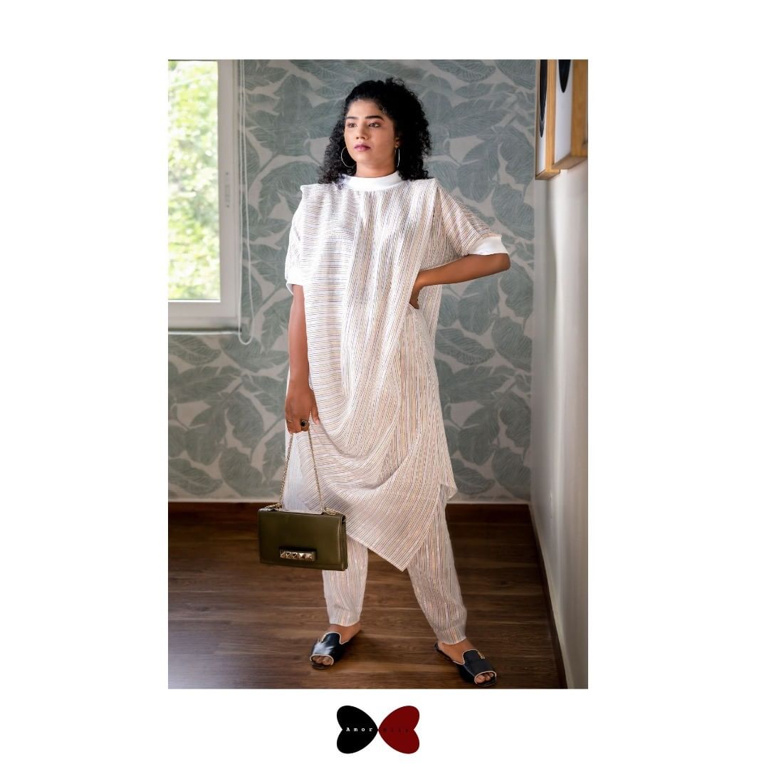 Cotton lurex vertical stripped drapy set with pant and top. Available only for the inbetween sizes which is sizes 10 and above. This futuristic dress is the most comfortable during a summer day out . It will give you the best comfort and the most stylish way out of your home. Let the world talk about what you wearing , for that Shop Amor Eliz designs for assured comfort and style. Price: 14,170/- INR.